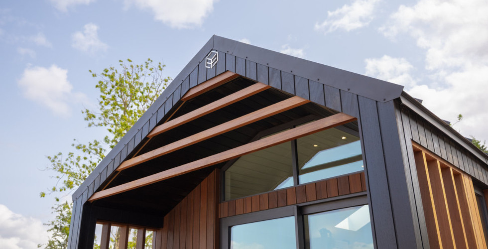 Externally, the home is clad in sustainably sourced Thermowood, chosen for its durability, natural beauty, and 60-year lifespan. It’s topped with a sleek standing seam metal roof for weather resilience and longevity. A distinctive overhanging gable end provides protection to the large glazed doors and adds a bold architectural feature to the façade.